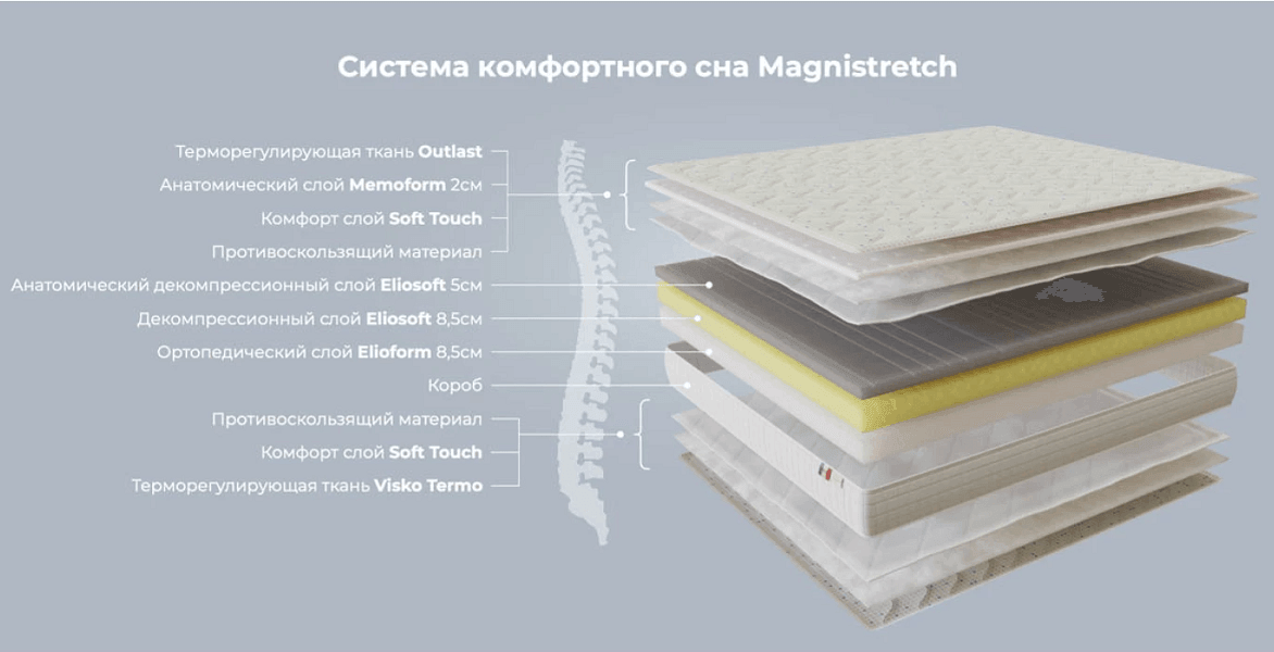 Magniflex MagniStretch 10 – беспружинный матрас из ортопедической пены. Гарантирует телу человека физиологическое положение во время сна Не допускает лишнюю нагрузку на позвоночник. Снимает мышечное напряжение, разгружаются межпозвоночные диски. Получить прекрасное анатомическое действие удается за счет применения пены с эффектом памяти, благодаря которой обеспечивается беспрепятственная циркуляция крови.